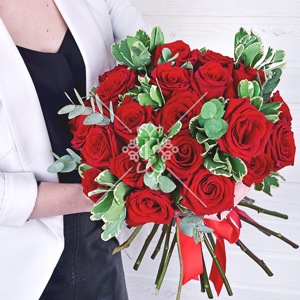 Насыщенно-алая роза  символизирует  глубокую любовь, привязанность и страсть, а так же уважение и восхищение. В обрамлении зелени эвкалипта  и питтоспорума – букет смотрится великолепно и стильно!